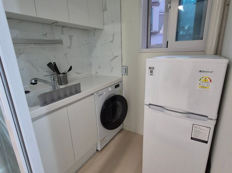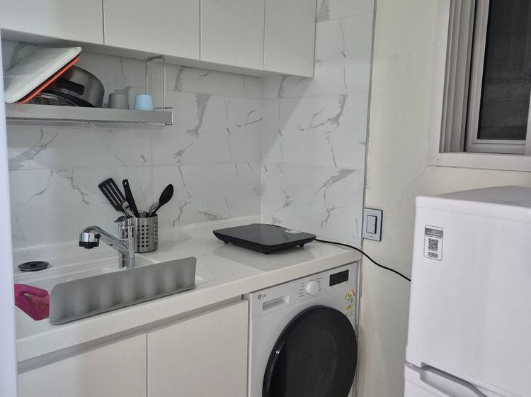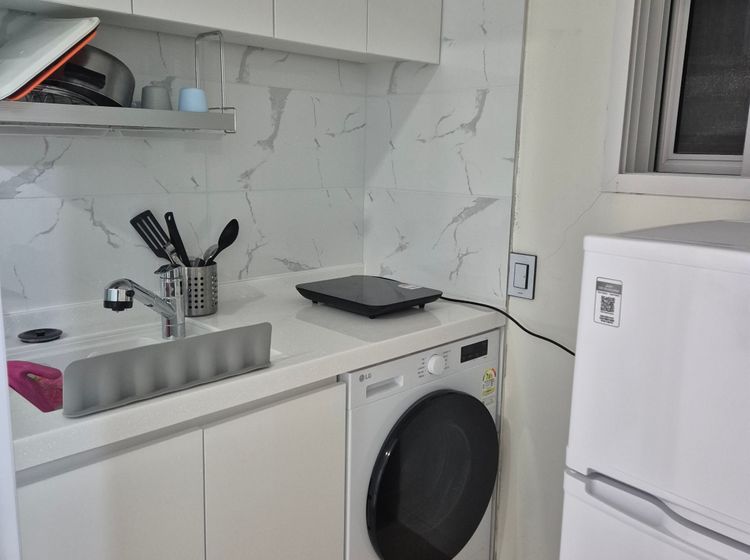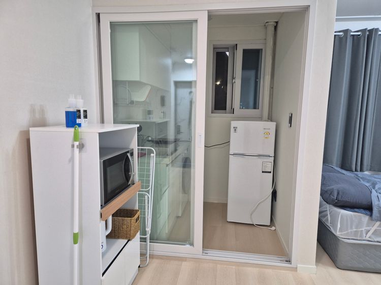 옵션: 전자레인지, 인덕션, 세탁기(건조겸용), 와이파이, 침대, 신발장,좌식 테이블, 프라이팬1, 냄비1, 2인용 식기, 칼, 가위, 도마, 세택세제, 섬유유연제, 샴푸, 바디워시, 휴지, 물티슈, 청소용품 구비되어 있습니다.