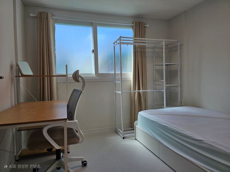 퀸 사이즈 수납침대, 에어컨, 옷장, 3도어 수납장, 2도어 수납장, 이중 암막커튼, 의자