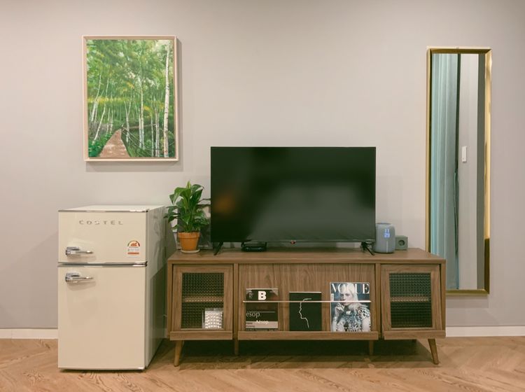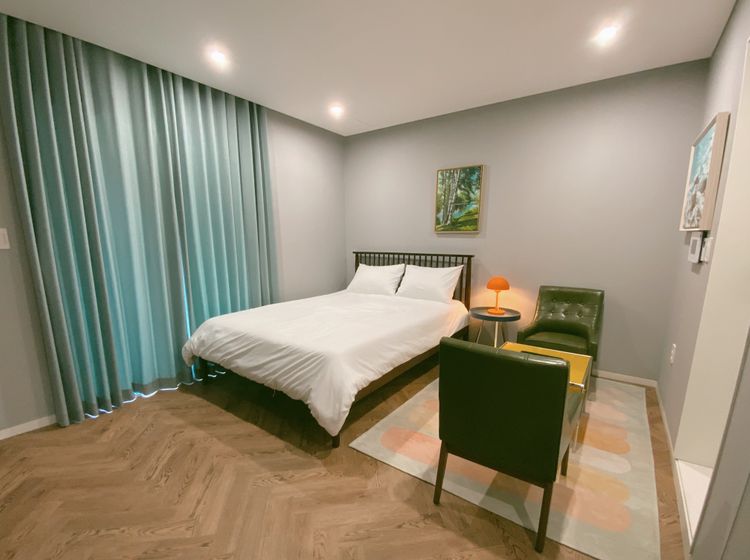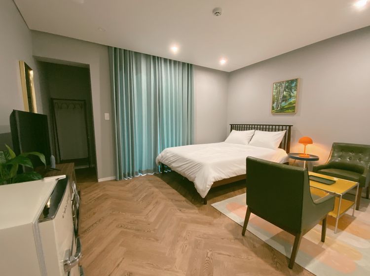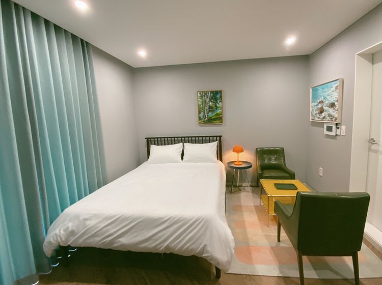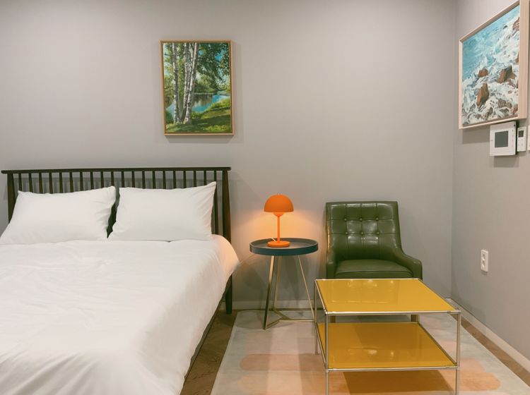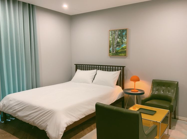 아늑한 원룸 구조에 퀸사이즈 Tempur 매트리스가 깊은 휴식을 돕고, 딥그린 커튼과 레트로 가구가 세련된 분위기를 더합니다.